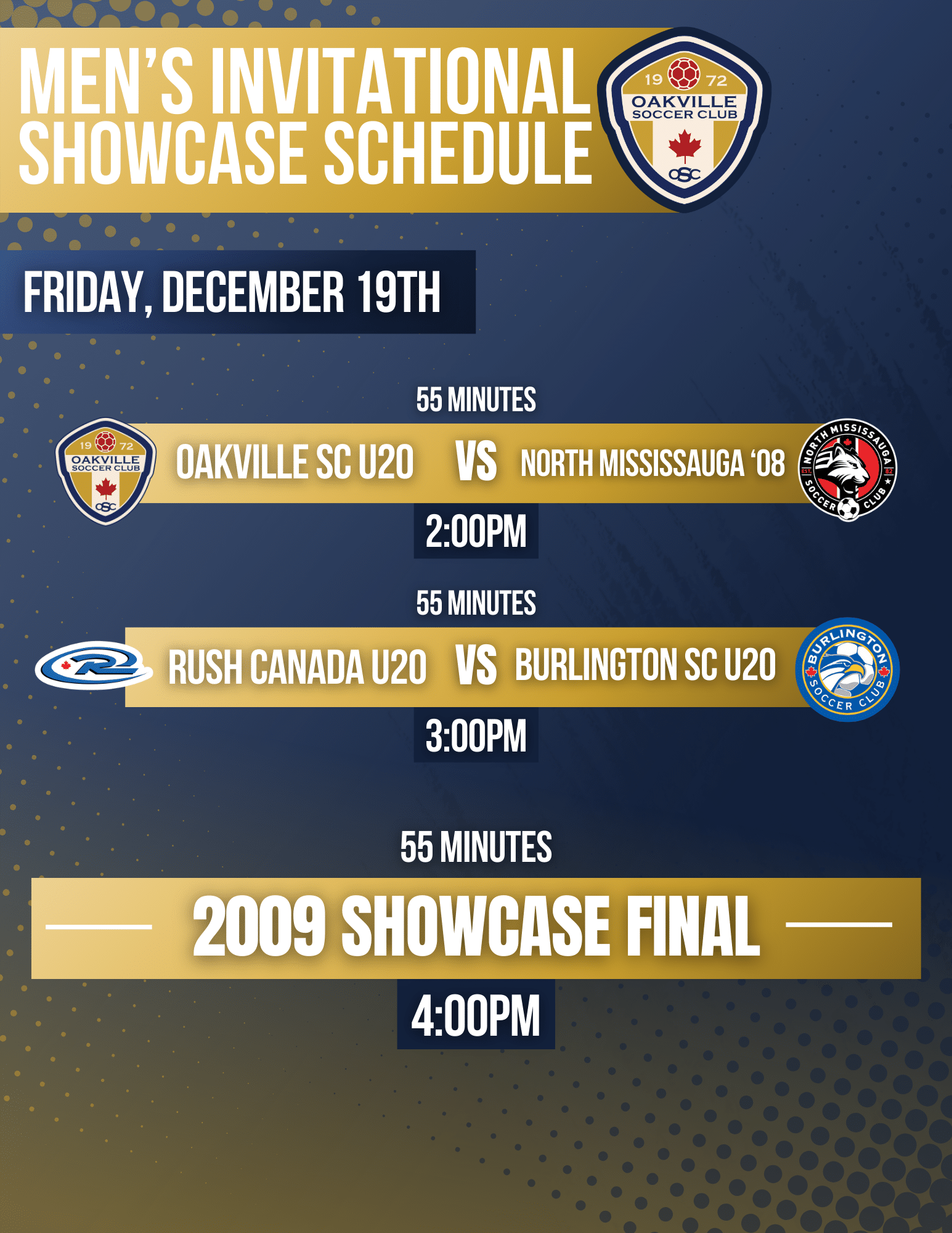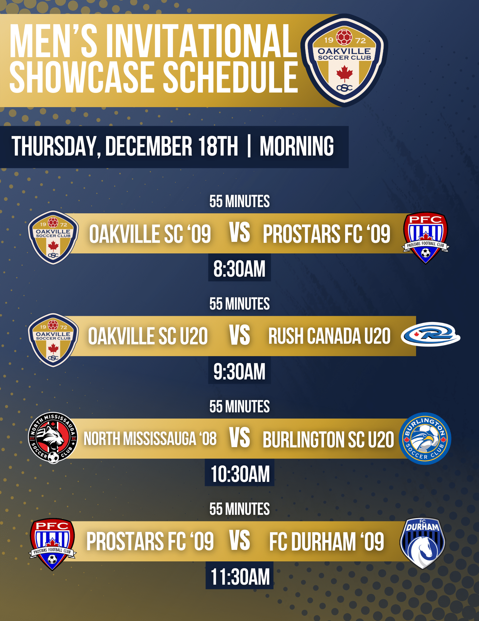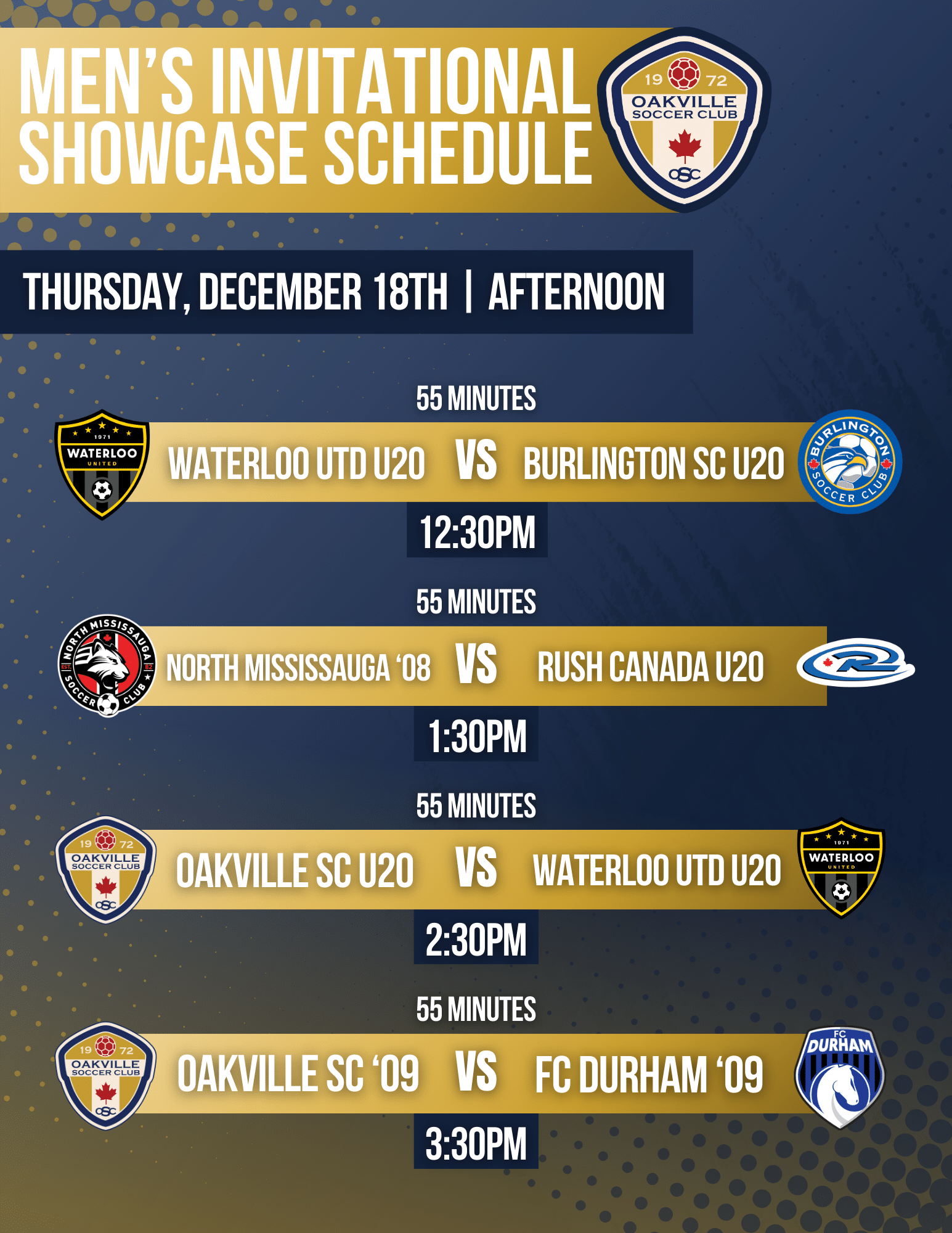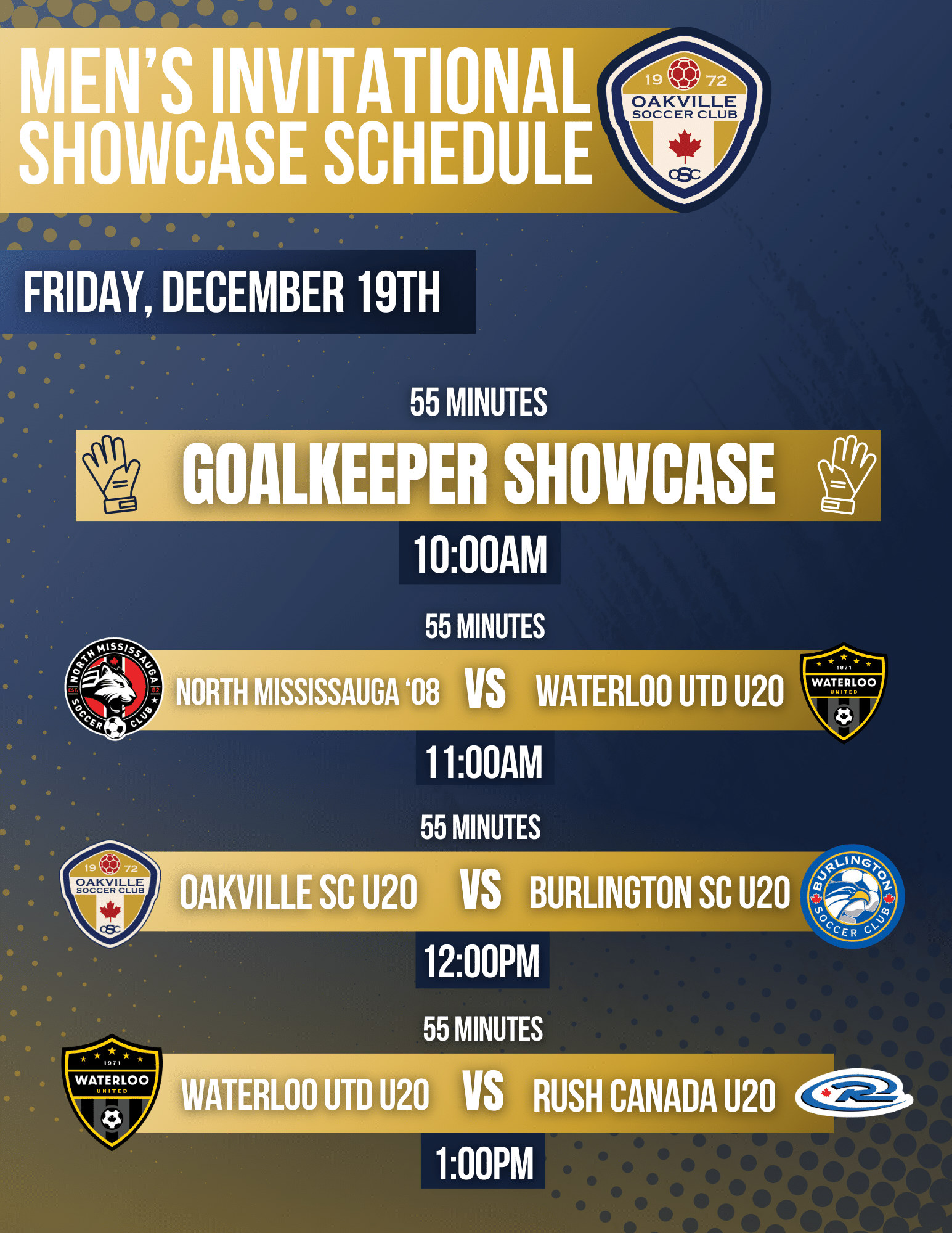 Oakville Soccer is excited to announce that we will be hosting our 2nd annual Men’s Invitational College Showcase on December 18th and 19th at the Pine Glen Soccer Centre. Please see below for further details on the event: